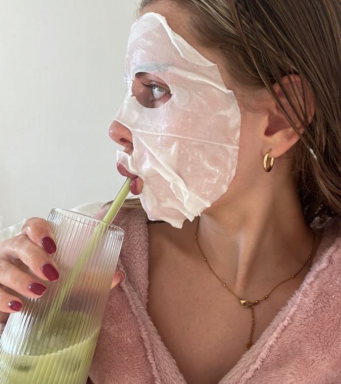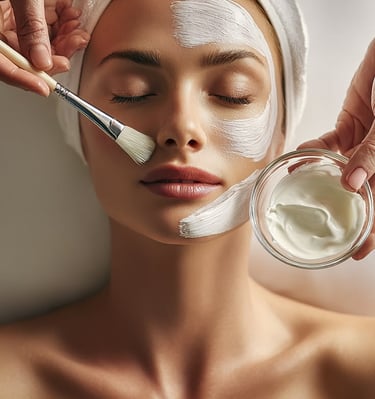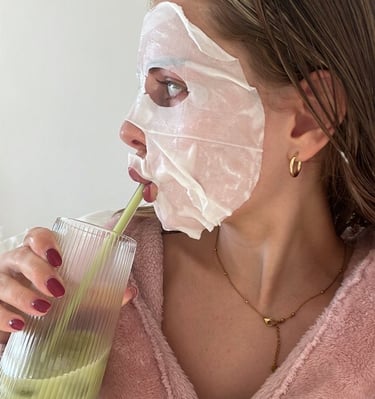 Soft-focus image of a woman relaxing with a facial mask, embodying self-care.
